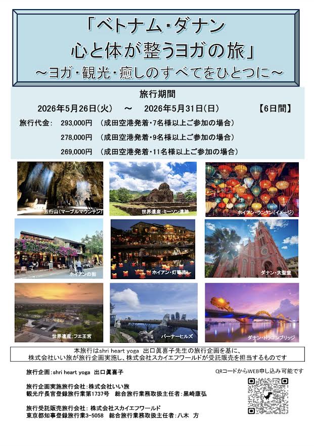 | 【5日目】ダ6月13日【土】 | ナン | 專用車 | 早朝午前午後夜 | ホテルにてモーニングヨガ12時のチェックアウトまで自由行動チェックアウト後、昼食。午後はダナン観光ダナン大聖堂、市場、ウォールアート街夕食後、お土産店、その後ダナン空港へ機内泊 | 朝:〇昼:ベトナム料理夕:海鮮 |