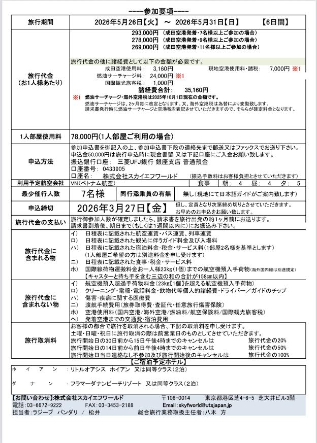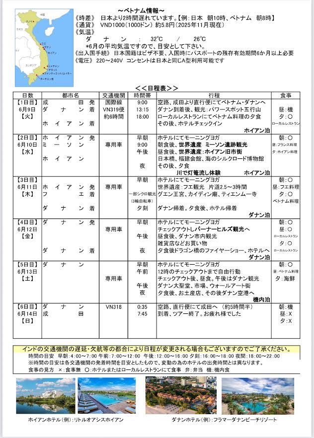 | 【6日目】6月14日【日】 | ダナン成田 | VN318 | 0:357:45 | 空路、直行便にて成田へ(約5時間半)到着、ツアー終了。お疲れ様でした | 朝:機昼:✕夕:X |